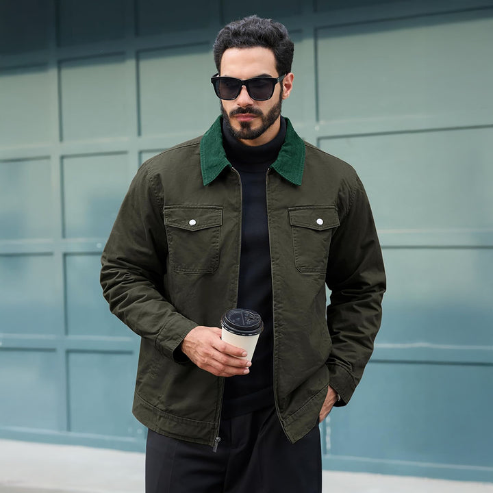 Design: Zipper-front closure with corduroy spread collar and zipper placket, combining utility with casual refinement.